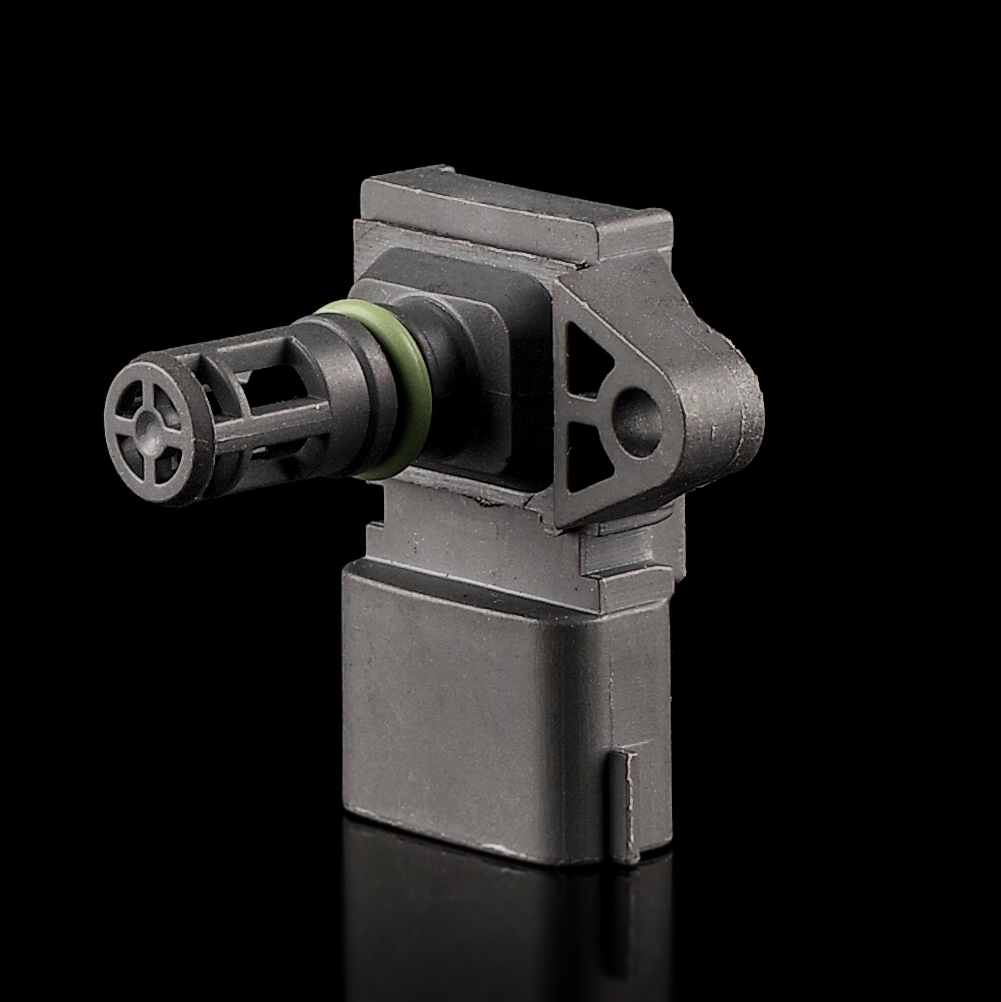 В конструкции датчика давления воздуха присутствует 2 камеры – атмосферная, связанная со впускным коллектором, и вакуумная. Там же расположены 4 тензорезистора, прикрепленных к диафрагме, и электронный чип. Давление воздуха действует на диафрагму, и она перемещает тензорезисторы, которые в зависимости от положения меняют сопротивление, что в итоге влияет на величину импульса от чипа к блоку управления.